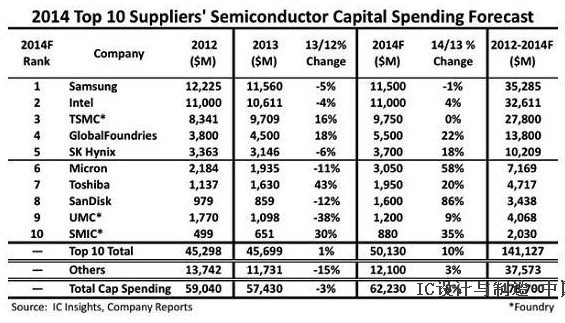 ICInsights指出,虽然包括SanDisk与Micron等记忆体供应商的2014年资本支出将会强劲成长,全球半导体产业资本支出规模前五大业者排行榜并未变动,Samsung与Intel稳居龙头,两大厂商的年度资本支出都超过110亿美元。