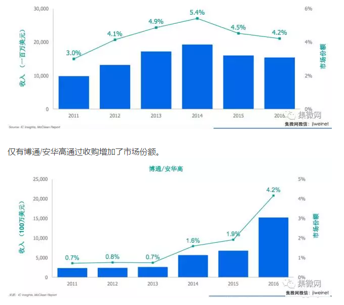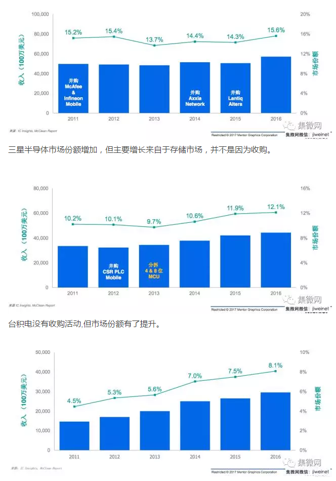 从另一个角度,半导体企业的营收水平,即赚钱能力是否通过收购,扩大公司规模而获得了提升呢?Wally分析,从营收水平来看,全球前五大半导体公司在过去几年的营收增长确实要比市场份额的增长要,但是整个半导体产业也是在不断增长的,相较之下,它们的市场份额并没有太大的增长。因此,全球领先的半导体企业无论是市场份额还是营收的增长的最大原因都不是并购,前五大公司中只博通/安华高是通过并购扩充了市场份额的。