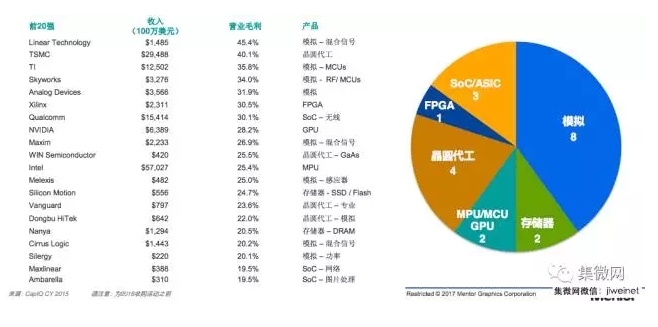 收购带来的一个比较明显的改变就是企业规模变大,那么半导体行业并购和规模经济之间有无联系呢?事实上,传统行业的规模经济并不适用于更广阔的半导体市场。规模经济指出, “规模越大,公司收益越大”,但实际上两者之间并无直接关系。在2016年盈利能力最强的半导体公司(收购之前)中,可以看到,最能赚钱的几家公司,规模并不大,英特尔就没有凌力尔特利润率高。