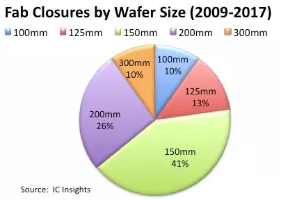 由于过去十年的严重经济衰退,全球工厂倒闭率在2009和2010激增。2009年共有25座晶圆厂关闭,其后22座在2010年关闭,20座晶圆厂于2012年和2013年关闭,2015年关闭了两座晶圆厂,这是2009-2017年期间每年关闭的最少数量。 2017年,3座晶圆厂被停止服务。 IC Insights已经确定了今年和明年将关闭的3座晶圆厂(两座150毫米晶圆厂,一座200毫米晶圆厂)。