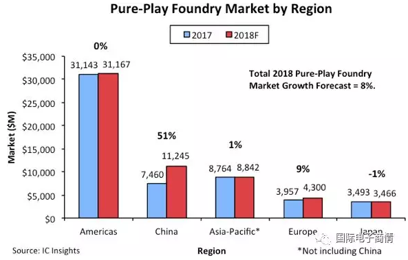 整体而言,IC Insights预测,2018年全球纯晶圆代工市场将增加42亿美元,达到590亿美元的规模,较2017年成长8%;中国将占全部成长(42亿美元)的90% 。