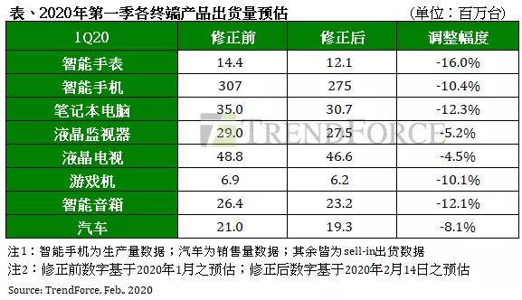 有鉴于疫情对于中国市场潜在的负面冲击,集邦咨询同步修正2020年三大应用别的出货规模,其中电视由219.6百万台下调至218.0百万台;监视器由125.8百万台下调至124.5百万台;笔记本电脑则由162.4百万台下调至160.2百万台,修正幅度分别为0.7%、1.0%与1.4%。