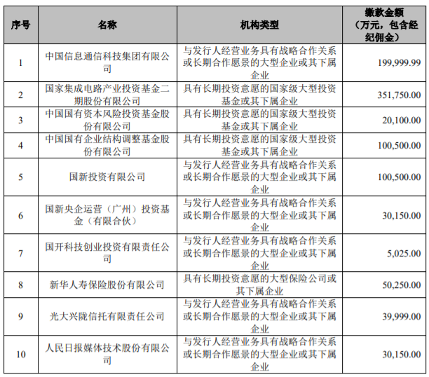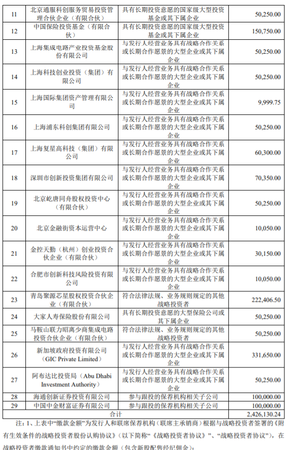 在战略配售方面,配售对象共29家,合计配售金额共242.61亿元。其中,国家集成电路产业投资基金二期获配金额35.175亿元,新加坡政府投资有限公司获配33.165亿元,青岛聚源芯星股权投资合伙企业(有限合伙)获22.24亿元,联席保荐机构相关子公司海通创投、中金财富获配股数均为3371.24万股。