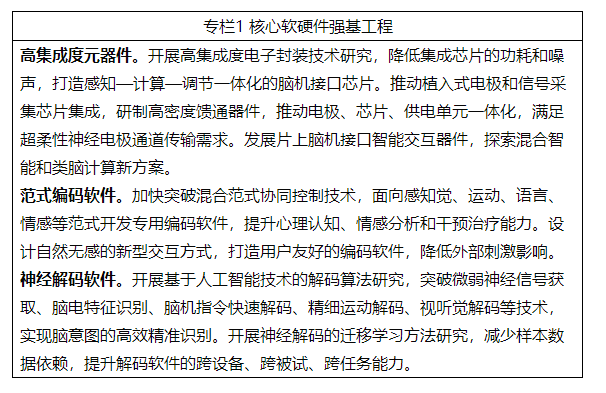 (二)突破关键脑机芯片。发展高通道、高速率脑信号采集芯片,强化模数转换、通道管理和噪声抑制,增强脑信号采集放大能力。研发高性能、超低功耗脑信号处理芯片,强化并行处理能力,推动感知、计算和调节等功能的一体化集成。研发超低功耗、高速率、高可靠的通信芯片,提升脑信号传输和抗干扰能力。