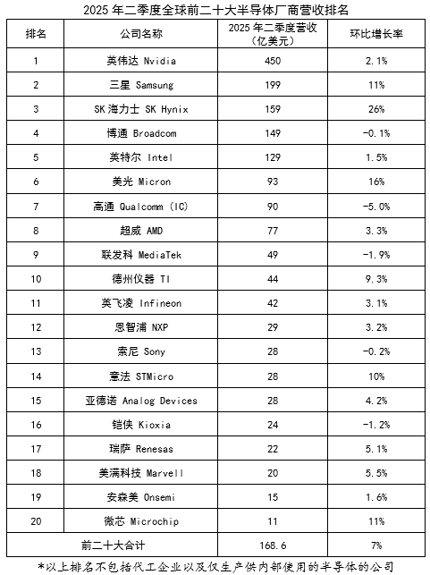根据WSTS公布的数据,2025年二季度,全球前二十大半导体企业的营收合计预计为1686亿美元。