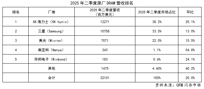 SK海力士二季度DRAM销售收入达122.71亿美元,环比增长25.1%,市场份额为38.2%,连续第二个季度位列DRAM市场第一;