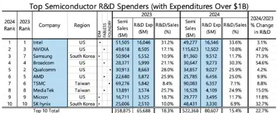 据市场研究公司TechInsights近日发布的《全球半导体公司2024年研发投入报告》显示,2024年全球排名前10位的半导体公司研发总投入为806亿美元,较上年增长22.7%。排名前20位的半导体公司的研发支出总额达986.8亿美元,较上年增长了17%,约占全球半导体行业研发支出总额的96%。
