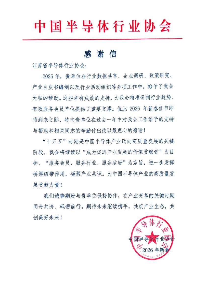 2026年2月11日,中国半导体行业协会向我协会发来感谢信,全文如下: