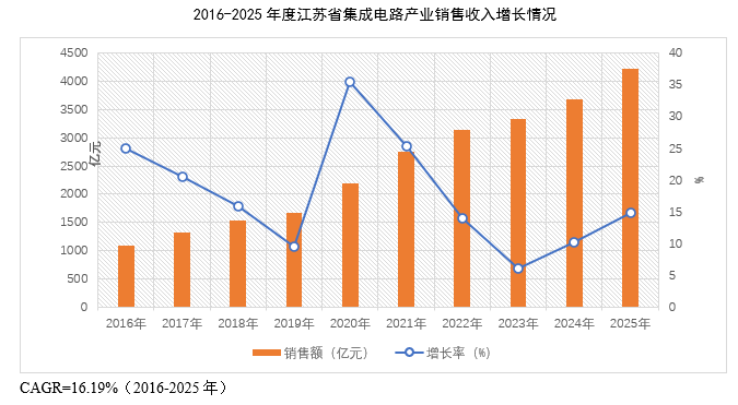 2025年,江苏省设计、制造、封测三业销售收入合计为4224.95亿元,同比增长14.90%。其中,集成电路设计业销售收入为1213.04亿元,同比增长14.28%;集成电路晶圆业销售收入为966.32亿元,同比增长12.84%;集成电路封测业销售收入为2045.59亿元,同比增长16.29%。